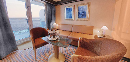 In addition to the normal services and equipment provided in all our cabins, Suite Guests enjoy special privileges to make their stay on board even more pleasant including a choice of pillow from the Pillow Menu, Whirlpool bath, bathrobe and slippers for guests to use throughout their cruise and a dedicated valet assigned to the room.